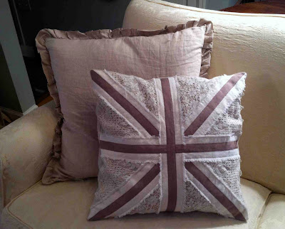 Just to be clear- these were not getting ready for baby this & thats. The this & that's going on where going to lots of antique stores & fabric stores so I could make these awesome union jack pillows Michele designed. Michele is an amazing designer, not so much sewer. So I made one for her & one for my moms. We used antique doilies & lacy table runners. linen fabric for the base of the pillow & velvet ribbon on Michele's & a really nice grosgrain ribbon for my moms. By the time we finished {It took us 2 super really late nights} needless to say my ankles were the size of my thighs...